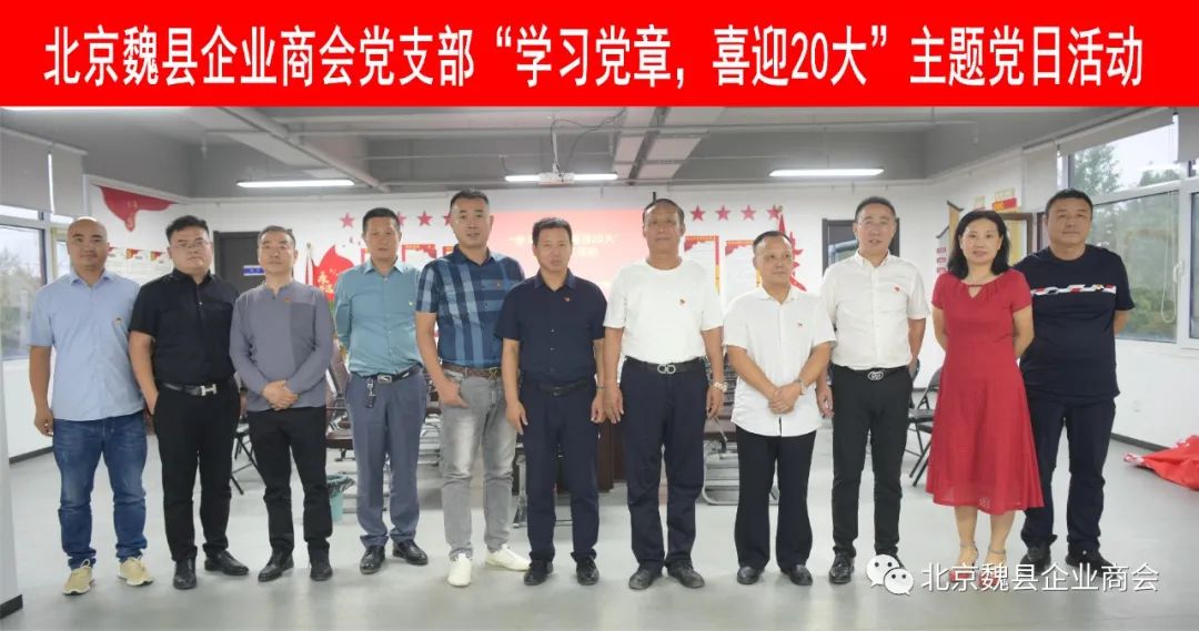 2022年9月19日下午,魏县商会党支部在通州北空会议中心的办公室举办“学习党章,喜迎20大”主题党日活动。党支部书记白冠平、副书记刘军亮、组织委员肖志勇、纪检委员蒋光辉、支部委员庞海龙和正式党员、预备党员、入党积极分子代表封新河、陈志强、张长河、陈平、郝清娣、刘祖印、李红冰、梁锋军、郭照衡、李丹等参加了活动。